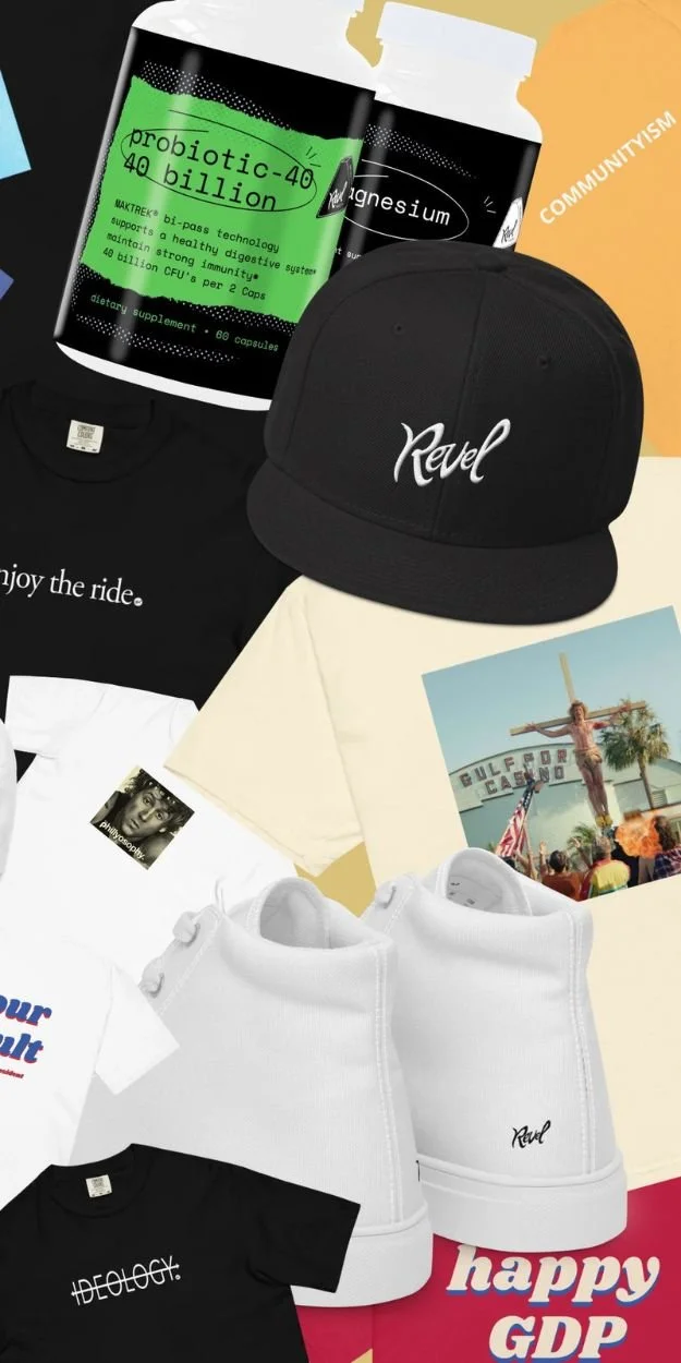 Revel-branded products that align with our lifestyle. Simple message driven clothing. Health products. New business extensions to come.